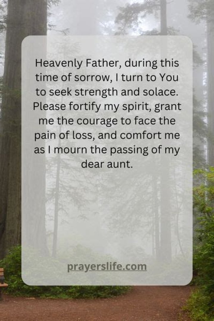 Prayer can be a powerful source of comfort, strength, and peace during the difficult time following the loss of a beloved aunt. Through prayer, we can express our emotions, honor our aunt's memory, seek divine guidance, and find solace amidst our grief. It is a way to connect with our aunt in spirit and to find strength and hope in the face of loss.