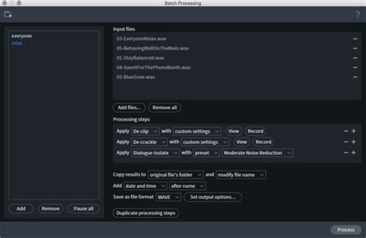The Batch Processing window allows for the creation of custom batch processing jobs, streamlining the time-consuming task of applying the same processing steps to multiple files. Several Batch Processing jobs can be queued simultaneously and run in the background, allowing the RX Audio Editor to be used for other tasks while the Batch Processing jobs are running.