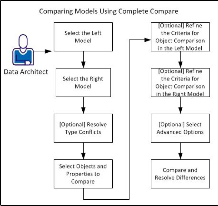 During the life-cycle of a model, as a Data Architect you create several versions of the model. After you create a database from the model, you may change the database, but not implement the changes in the model. Similarly, you may update the model over time but not update the same changes in the database. This results in the model and the database not being up-to-date. At some point, you may want to compare models or databases to know the differences in the objects and properties. The Complete Compare feature lets you compare two models and resolve differences between the two models.
