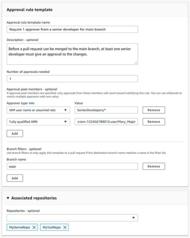 - CodeCommitApprovers : This option only requires an Amazon Web Services account and a resource. It can be used for both IAM users and federated access users whose name matches the provided resource name. This is a very powerful option that offers a great deal of flexibility. For example, if you specify the Amazon Web Services account 123456789012 and Mary_Major , all of the following are counted as approvals coming from that user: