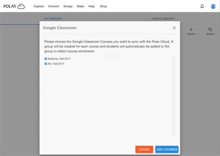 At the “Google Classroom” screen, select any classes for whichyou wish to create corresponding Polar Cloud groups, and click the“ADD COURSES” button; see Figure 7.10.
