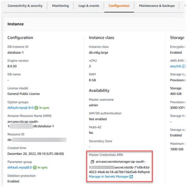 creating- The secret is being created.active- The secret is available for normal use and rotation.rotating- The secret is being rotated.impaired- The secret can be used to access database credentials, but it can’t be rotated. A secret might have this status if, for example, permissions are changed so that RDS can no longer access either the secret or the KMS key for the secret. When a secret has this status, you can correct the condition that caused the status. Alternatively, modify the DB instance to turn off automatic management of database credentials, and then modify the DB instance again to turn on automatic management of database credentials.KmsKeyId -> (string)