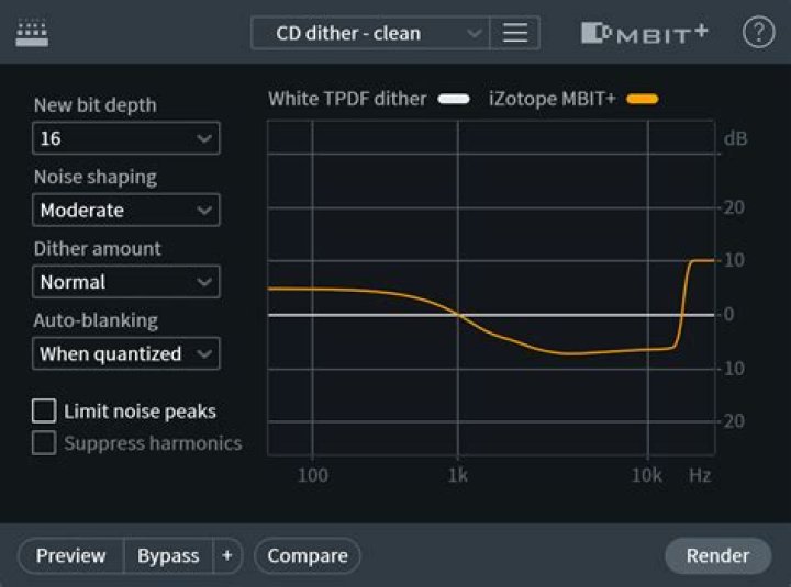 Dithering is a necessary process when converting audio from a higher bit resolution to a lower bit resolution. Dithering is used to tame the quantization distortion that happens when converting between bit depths due to requantization. Dither also preserves more of the dynamic range of a signal when converting to a lower bit depth. The Dither module applies iZotope’s MBIT+ dithering and noise shaping technology to maintain the highest audio quality possible when you are converting to 24, 20, 16, 12, or 8 bits. MBIT+ uses psychoacoustic methods to distribute dithering noise into less audible ranges. The result is a more pleasing sound and smoother fades.