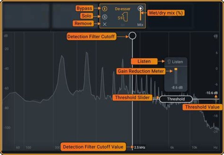 Engage Listen to monitor the difference between the unprocessed and processed signals. This outputs only the signal content being reduced by the De-esser. Try adjusting the Threshold and Detection Filter Cutoff until the Listen output only contains the ess sounds you are trying to reduce.