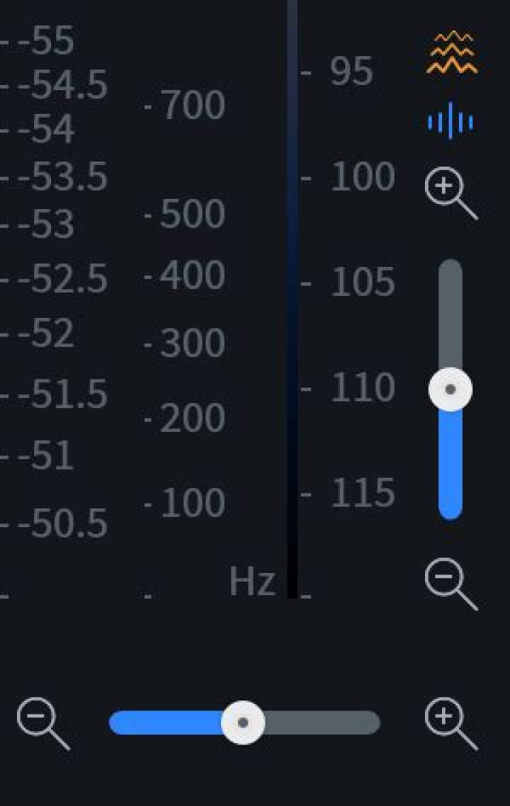 The vertical slider in the lower right-hand corner of the spectrogram/waveform display controls the zoom level for the spectrogram or waveform amplitude ruler(s). The buttons above the vertical slider select which ruler it will affect when adjusted.
