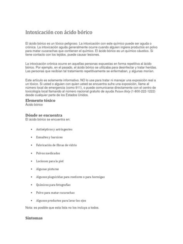 La intoxicación con ácido bórico, un tóxico peligroso, puede ser aguda o crónica. La intoxicación aguda generalmente ocurre cuando alguien ingiere productos en polvo para matar cucarachas que contienen el químico.