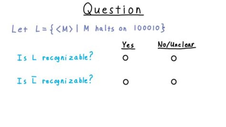 Indicate whether you think that L is recognizable and whether L complement is recognizable. We don’t have a way proving that a language is not recognizable yet, so I’ve labeled the “No” option as unclear.