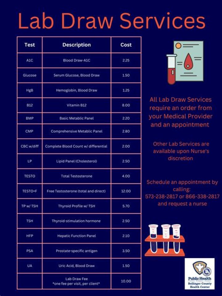 | Basic Metabolic Panel (BMP) | $60 | 24-48 hours | Blood draw |