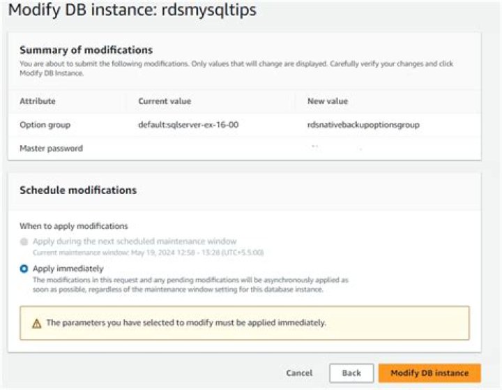 These changes are applied during the next maintenance window unless the ApplyImmediately parameter is enabled for this request. If you change the parameter from one non-zero value to another non-zero value, the change is asynchronously applied as soon as possible.