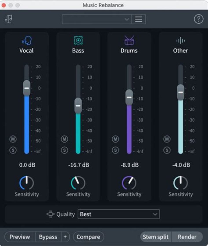 - Sensitivity: Determines how much of the input signal will be categorized as something other than Voice, Bass, or Percussion by the separation algorithm.