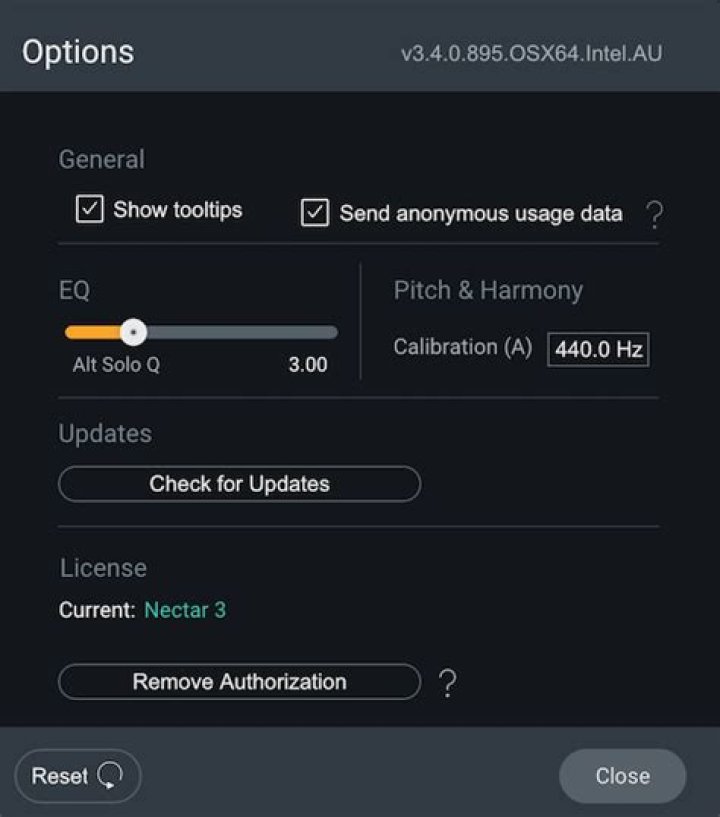 The Options window includes parameters for managing authorization, updates, and module specific controls. The Options window can be opened by clicking on the gear button in the upper right corner of the Nectar 3 interface.