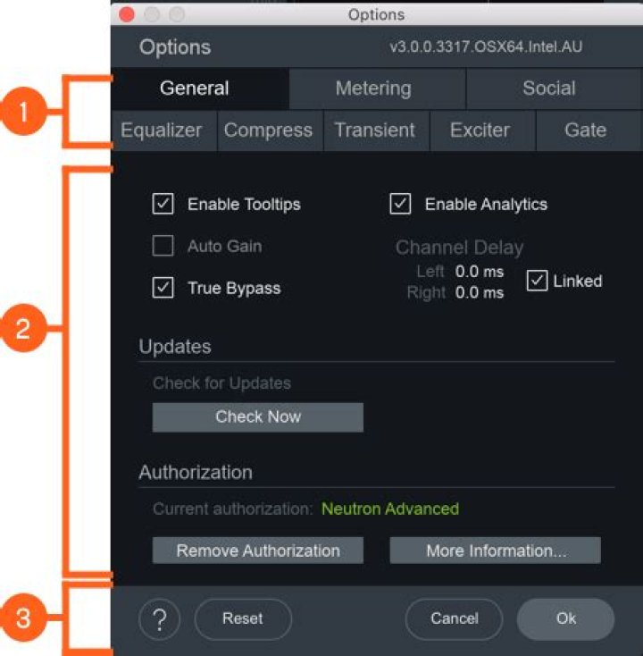 The Options window allows you to manage your authorization, check for updates, and adjust global and module processing controls. Click on the gear button in the upper right corner of the Neutron 3 interface to open the Options window.