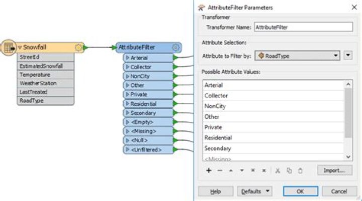 - Filtering out unwanted geometry types; for example, removing non-linear features before using an AreaBuilder transformer