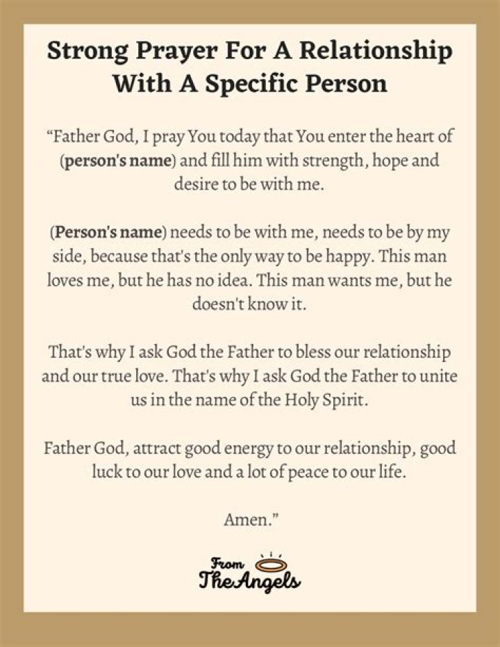 Prayer for a relationship with a specific person is a type of prayer in which an individual expresses their desire for a romantic relationship with a particular person. This type of prayer is often used to ask for guidance, support, and clarity in matters of the heart. Prayers for relationships with specific people can also involve asking for help in overcoming obstacles, healing past wounds, and building a strong and lasting connection.