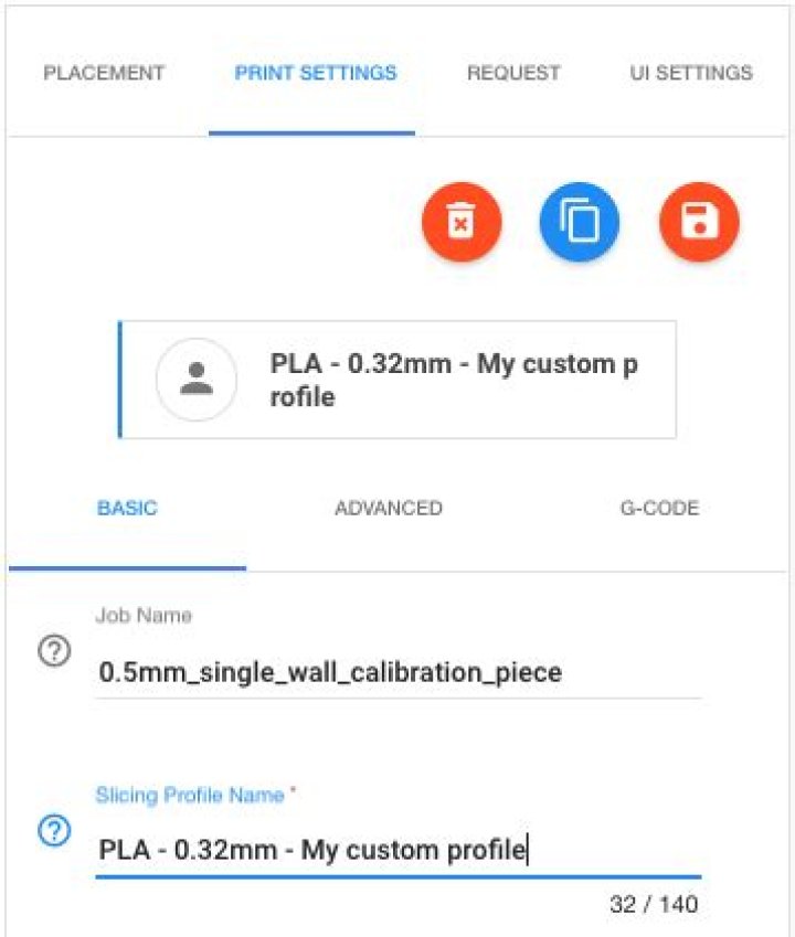 To generate a custom slicing profile, first duplicate one of thealready defined slicing profiles via the “Duplicate slicingconfig” button (the middle button directly underneath “PRINTSETTINGS”; see Figure 10.16). Give your custom slicing profile an appropriate name, using the “Slicing Profile Name”fieldunder “BASIC” settings; see Figure 10.16. Then make your desiredadditional adjustments to the slicing profile via the “BASIC”,“ADVANCED”, and “G-CODE” screens. Once your slicing profile iscomplete, save it by clicking the “Save config” button (therightmost of the three buttons directly underneath “PRINTSETTINGS”).