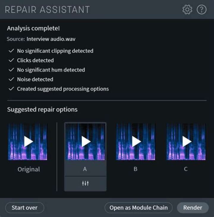 After the preview generation is complete, the Repair Assistant window will update and display playback buttons for the original audio and three processing chain preview buttons.