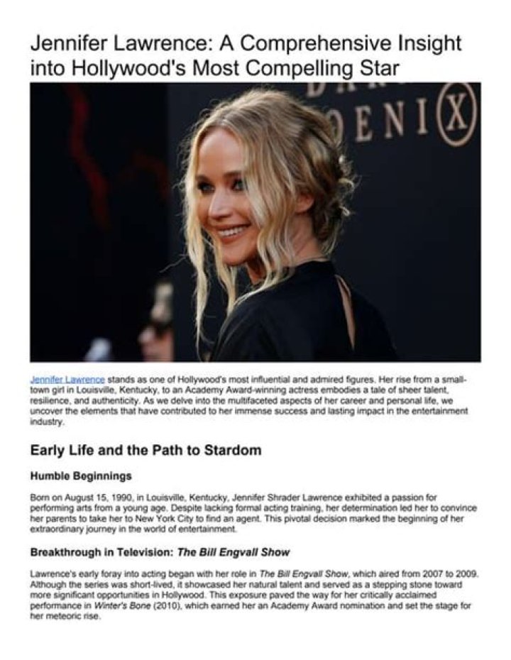 Jennifer Lawrence is a renowned American actress, born on August 15, 1990, in Indian Hills, Kentucky. She gained recognition for her roles in various films, including her iconic performance in "The Hunger Games" series and her Academy Award-winning role in "Silver Linings Playbook." With her down-to-earth personality and remarkable talent, she quickly became a household name, earning multiple accolades and nominations throughout her career.
